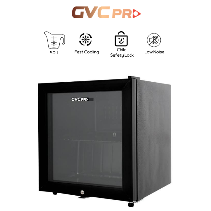 ثلاجة جي في سي برو عرض صغيرة للمشروبات – 50 لتر – باب زجاجي أسود