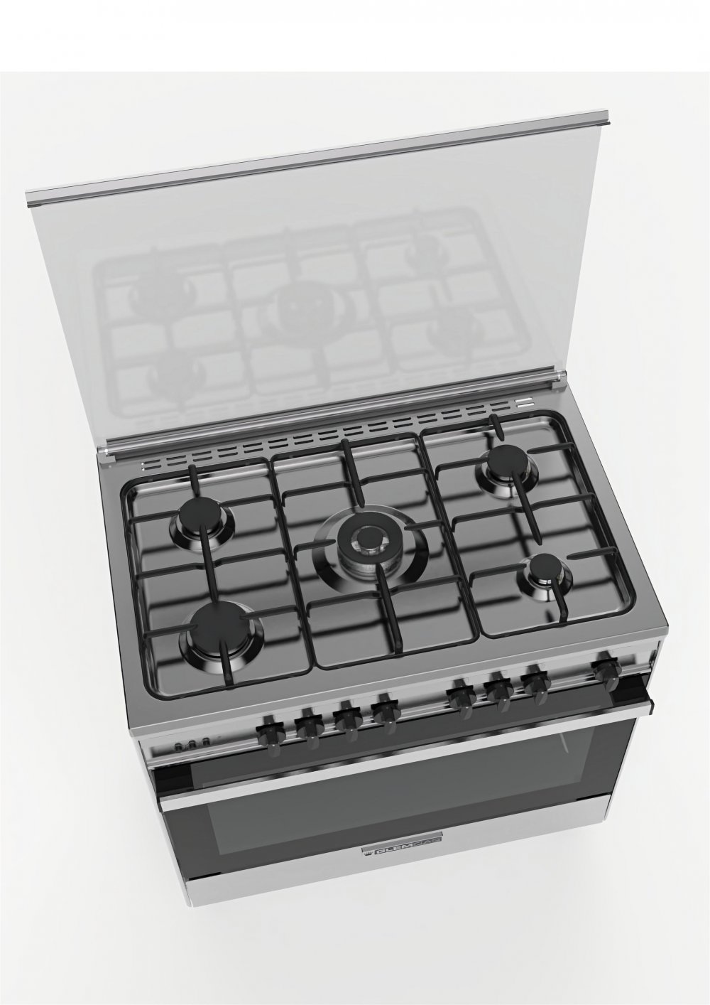 يتميز هذا الفرن بتصميم أنيق من الستانلس ستيل مقاس 90 سم، مما يمنحه متانة عالية ومظهراً لامعاً يندمج بسهولة مع ديكور المطبخ. يأتي مزوداً بخمس شعلات غاز توفر مرونة في استخدام أواني الطهي بمختلف أحجامها، مما يسهل إعداد أكثر من طبق في الوقت نفسه.